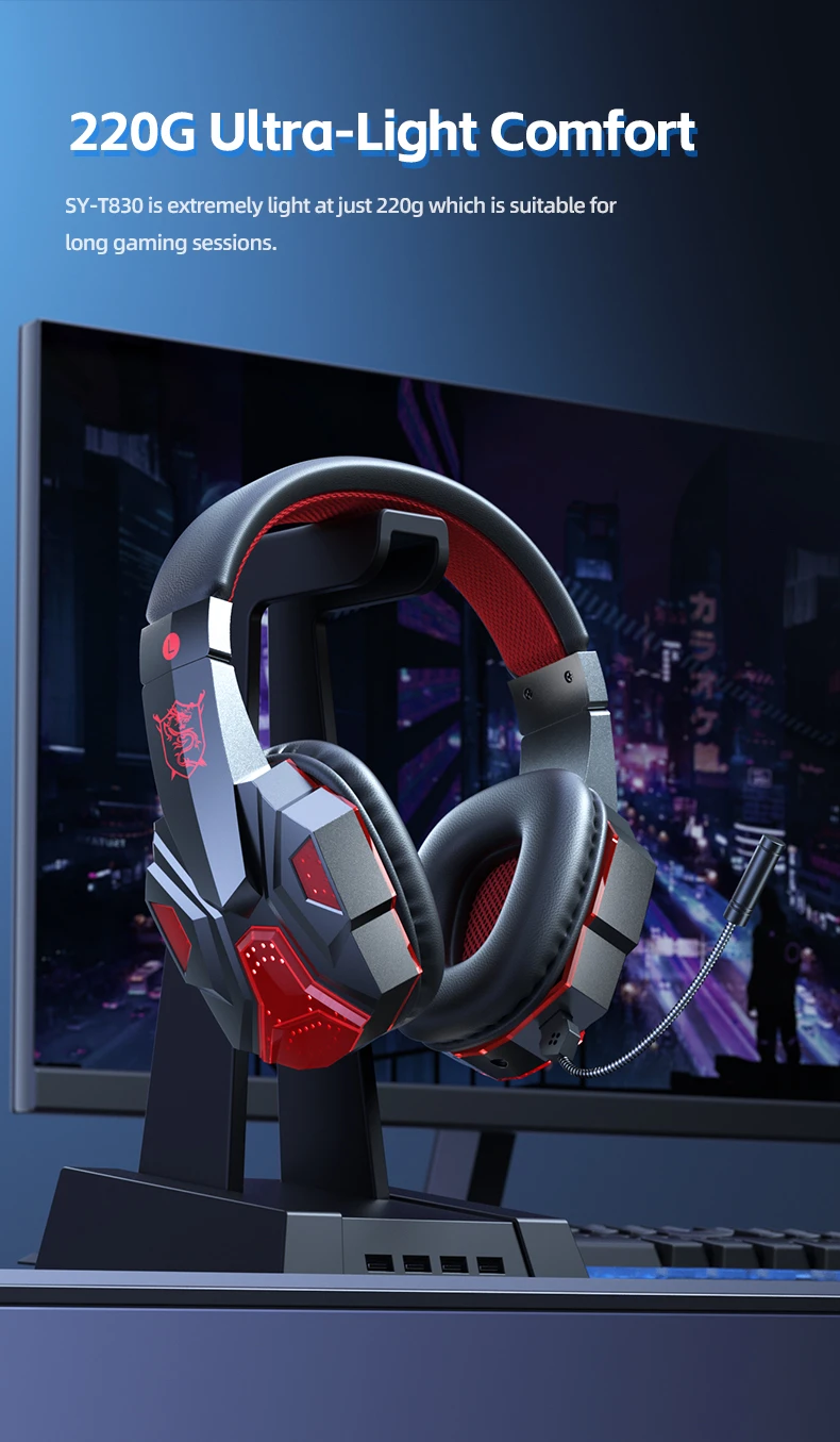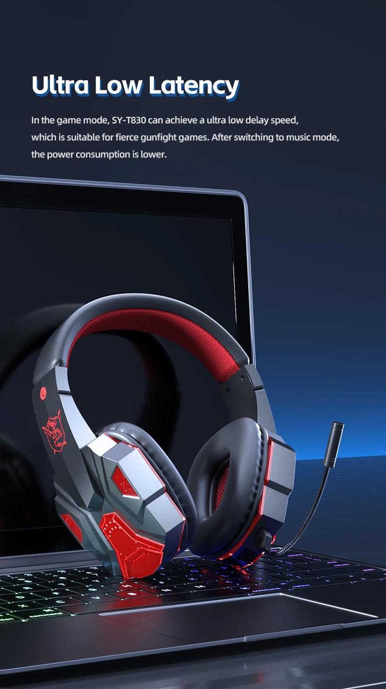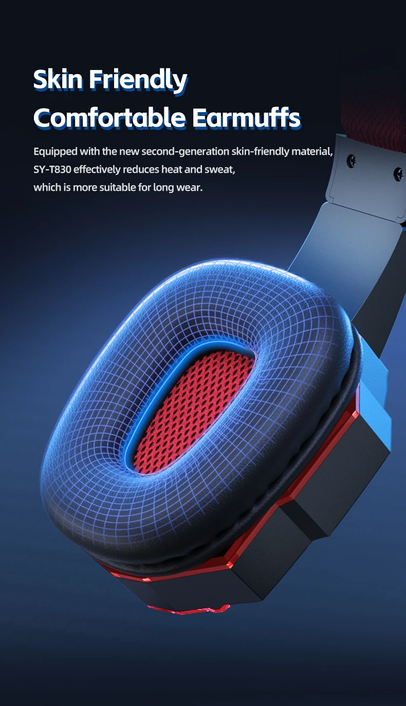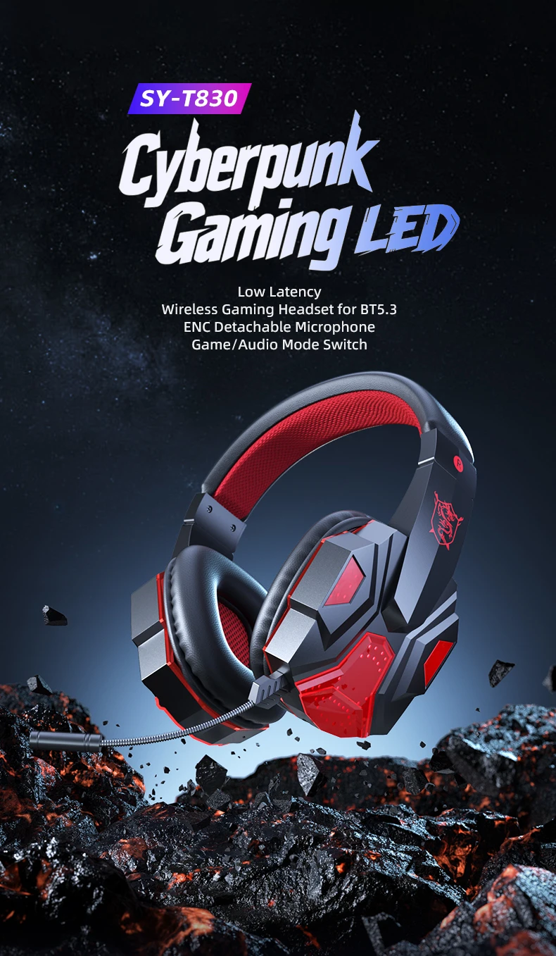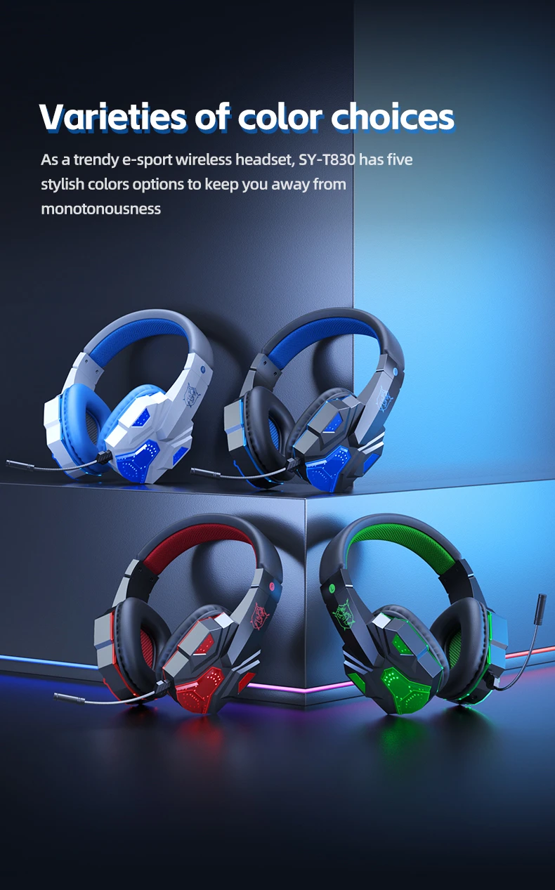 Casque de jeu sans fil Soyto T830 BT5.3 avec micro, écouteurs circum-auriculaires et éclairage LED pour PC, téléphone, ordinateur portable, jeux, musique et films.