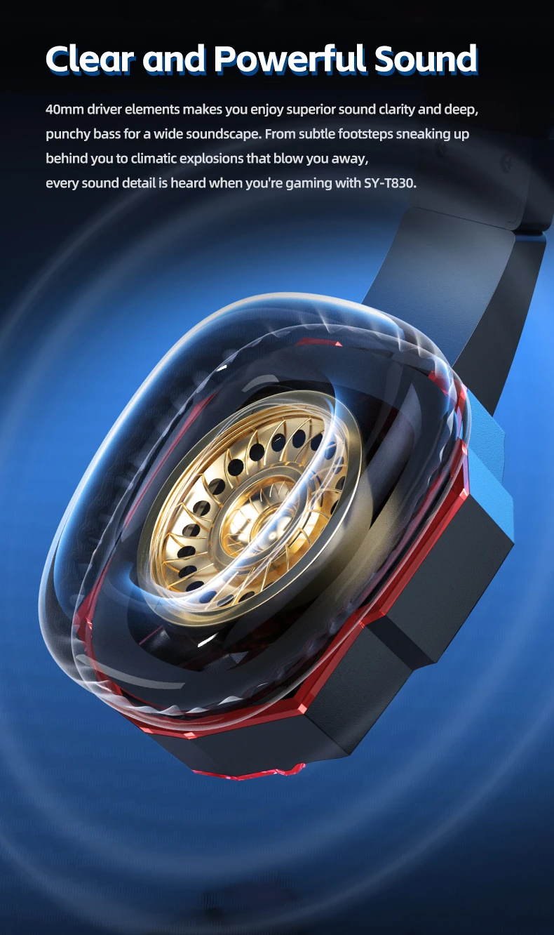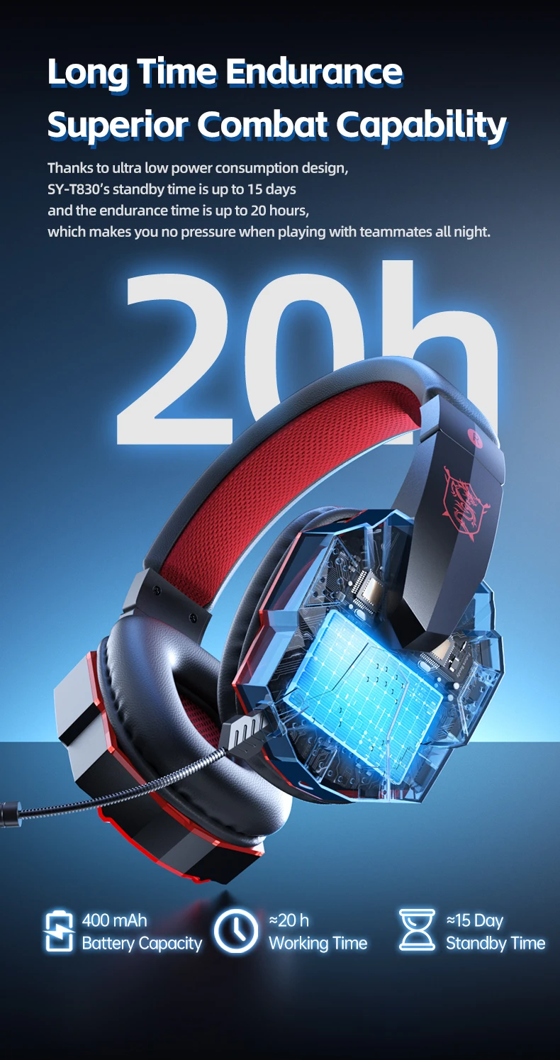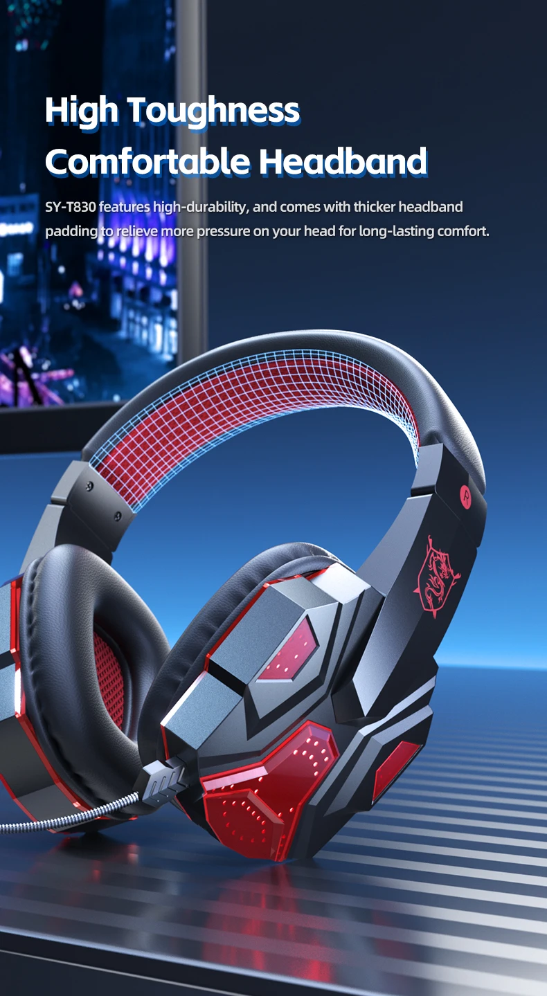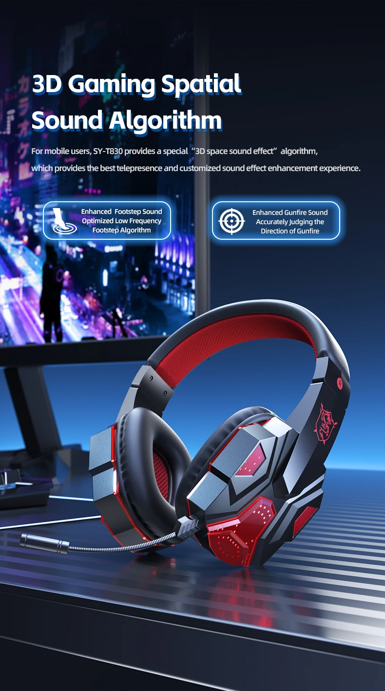 Casque de jeu sans fil Soyto T830 BT5.3 avec micro, écouteurs circum-auriculaires et éclairage LED pour PC, téléphone, ordinateur portable, jeux, musique et films.